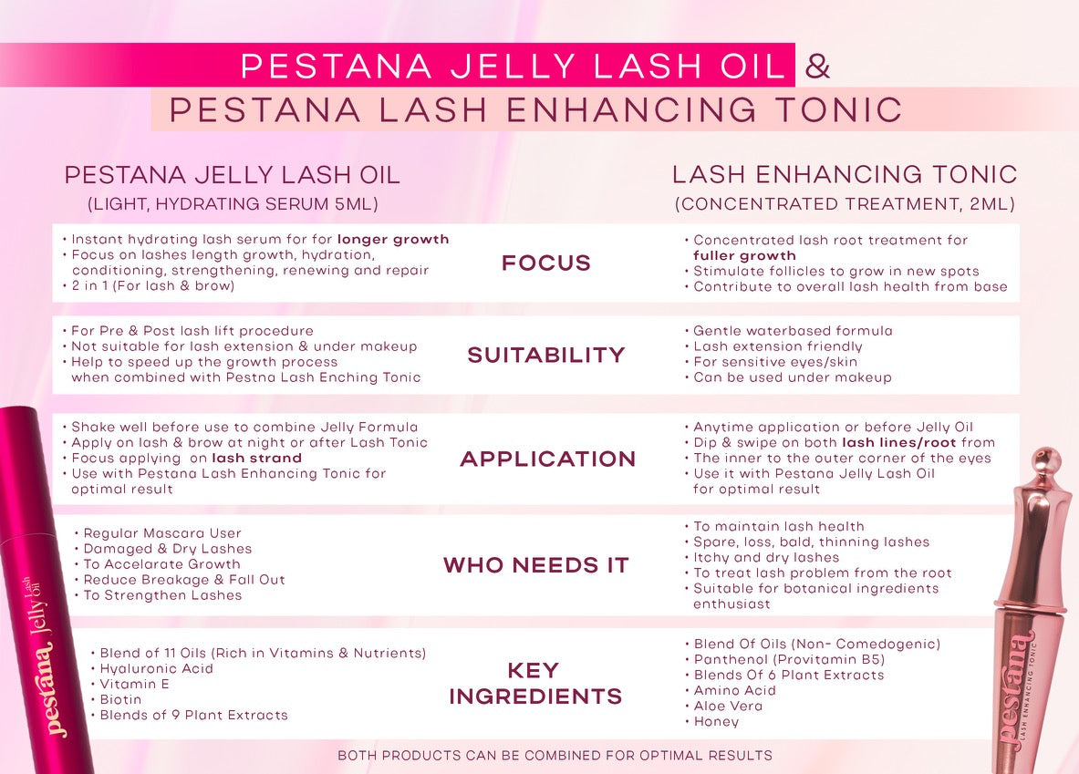 **THE MAIN DIFFERENCE BETWEEN PESTANA JELLY OIL AND PESTANA LASH ENHANCING TONIC IS THAT PESTANA JELLY OIL IS A SERUM FOCUSING ON EACH LASH STRAND, WHILE PESTANA LASH ENHANCING TONIC IS A HIGHLY CONCENTRATED TREATMENT TARGETING THE LASH ROOTS AND FOLLICLES. THESE TWO PRODUCTS CAN BE COMBINED FOR BETTER RESULTS.